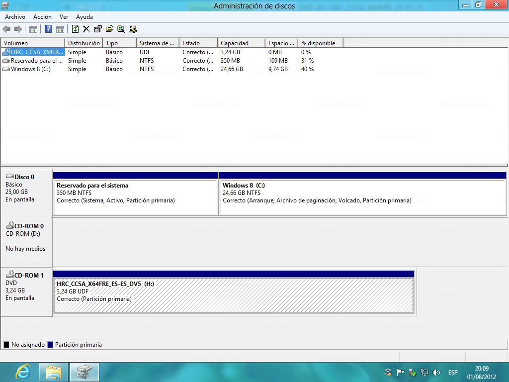 Primero comprobamos particiones de los discos y unidades ópticas desde el administrador de discos, viendo que existen dos particiones en el Disco 0, una de 350MB (arranque) y otra de 24,66GB (sistema operativo Windows 8 C:).
